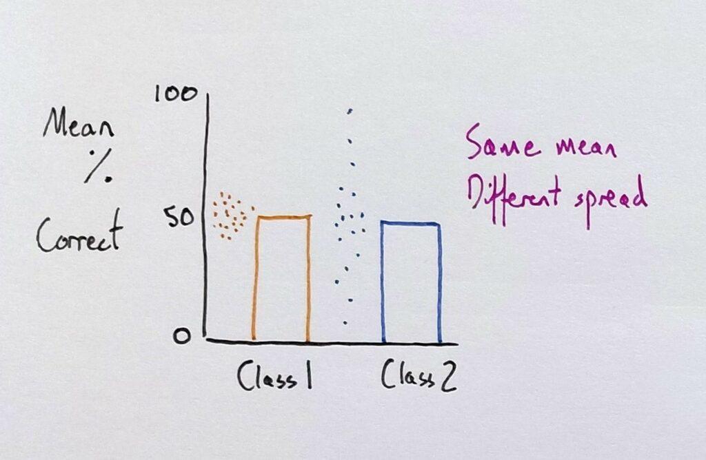 The scores of one class spread little from the mean, whereas the other’s spread further from their mean. This step has varied one thing. It has kept invariant the curriculum, the exam, and each class’ mean result; only the spread of results has varied. This, then, has brought it to the attention of the students.