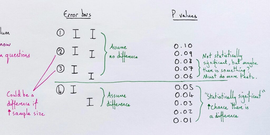 I draw the error bar examples (on the left) one by one and ask students whether they would assume that it was a real difference.