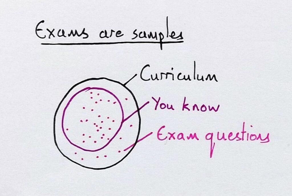 If you’re lucky, a test samples the part of the curriculum you know. If you’re unlucky, it’ll test everything you don’t know. Most of the time, it’s somewhere in between. I ask students if it’s better to have a larger or smaller sample (the dots) on an exam, and they agree that a larger sample is less risky. I point out that it’s also more reliable as a measure of what they know.