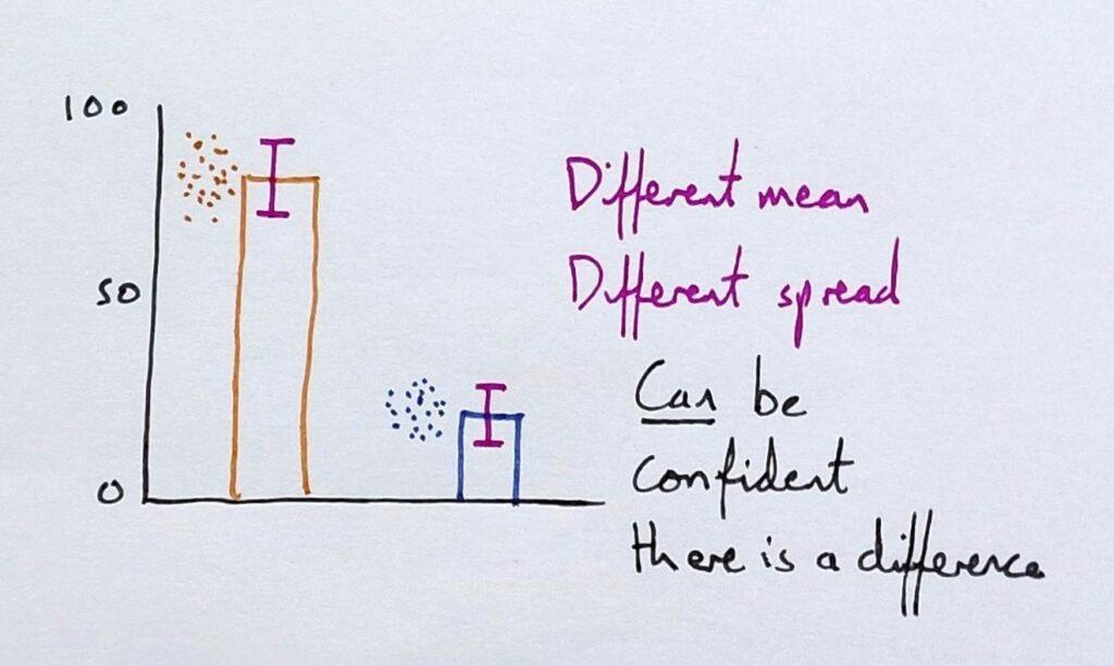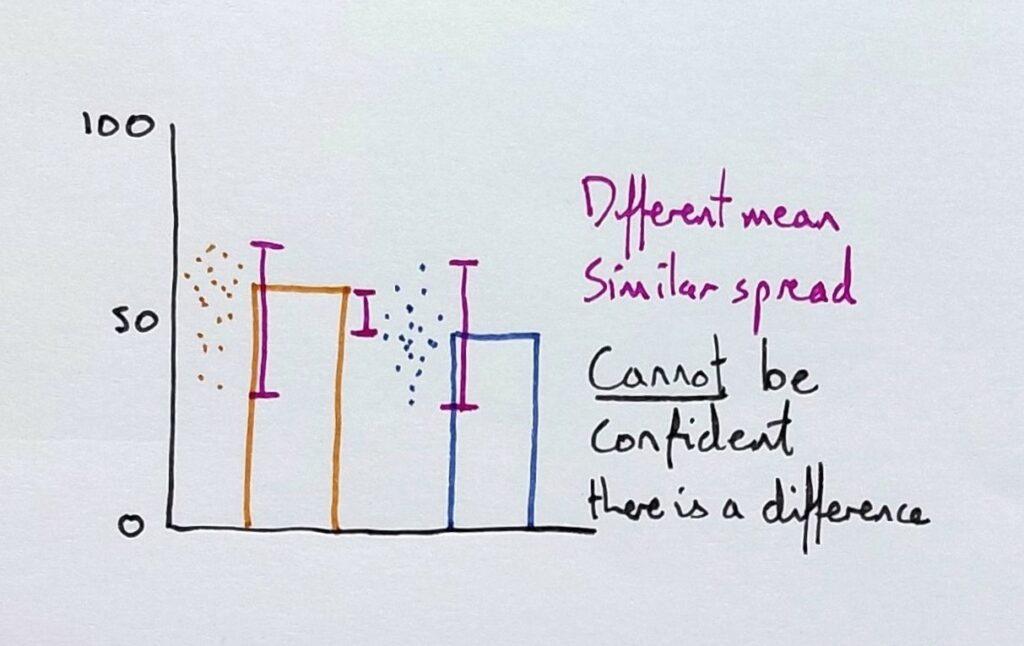 I also give them the exception that error bars may overlap and still represent a difference when the sample size is very large. With this, they should seek better verification of how confident they can feel.